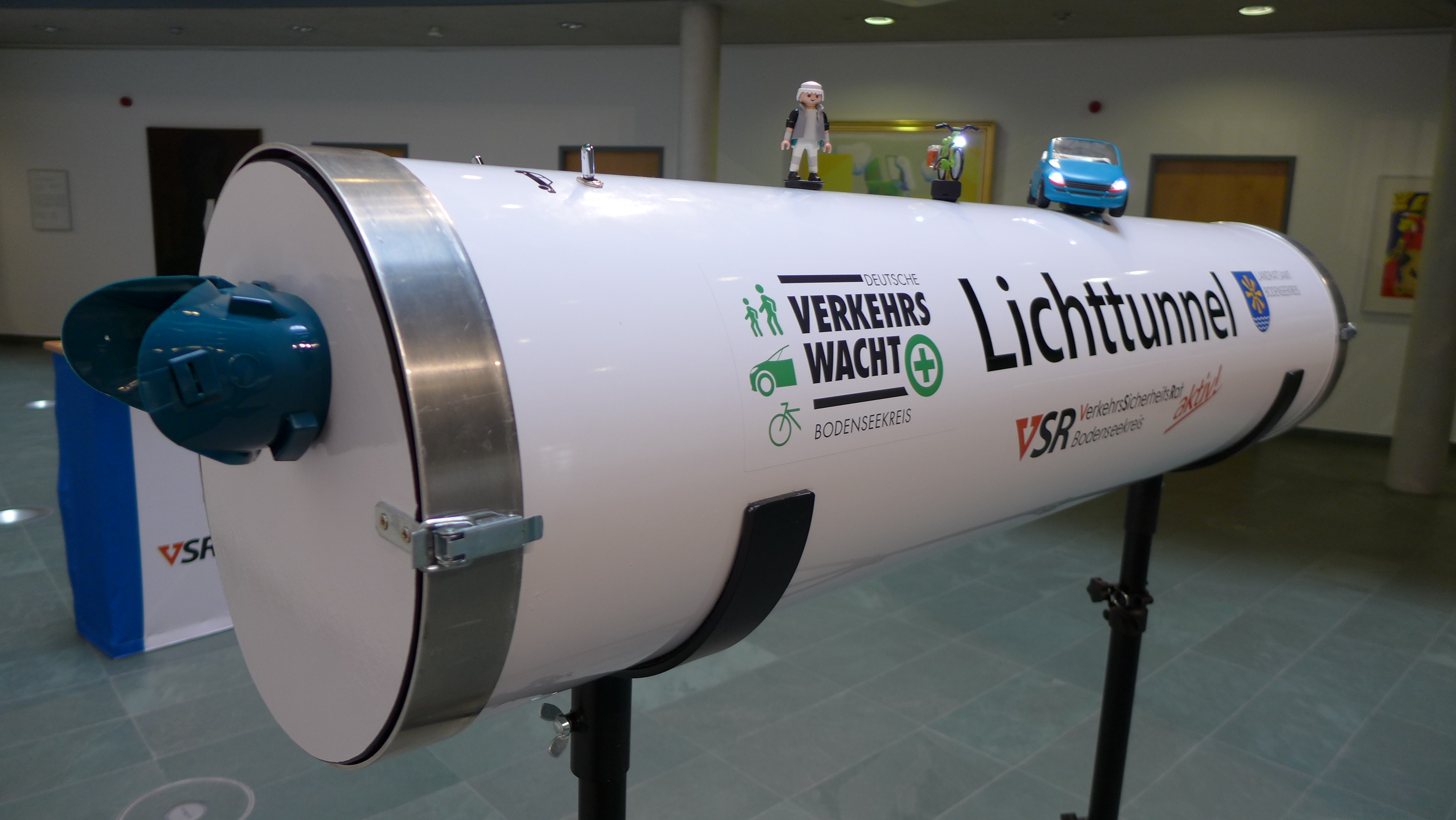 Die Verkehrswacht Bodenseekreis hat einem Pressetext des Landratsamtes zufolge nun einen Lichttunnel im Einsatz. Betrachtern, die in die dunkle Röhre blicken kommen Spielfiguren entgegen: ein Radler und ein Auto mit und ohne Beleuchtung oder Sicherheitskleidung. Der Blick in den Tunnel soll deutlich machen: Wer bei schlechter Sicht im Straßenverkehr zu spät zu erkennen ist, bringt sich in große Gefahr. Vor allem Kinder und Jugendliche sollen so aufgerüttelt werden, erklärt Harald Müller, Vorsitzender des Verkehrswacht-Vereins. Der Lichttunnel wird unter anderem beim Häfler Stadtfest am Sonntag, 16. Oktober der Öffentlichkeit gezeigt.